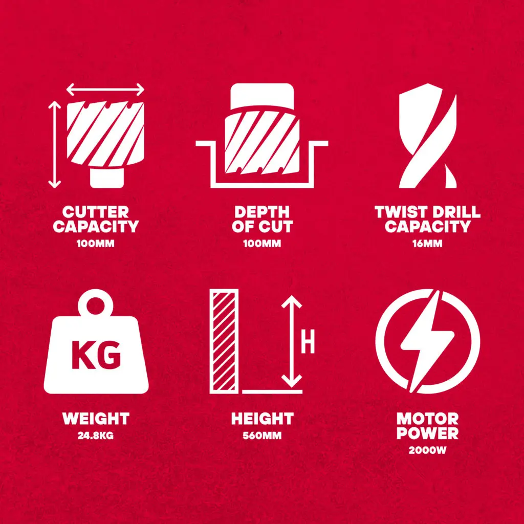 Element 100 är lämplig för borr- och skärdjup för stora diameter. Upp till 100 mm i diameter, 100 mm djup. Har även framåt och bakåt funktionalitet för gängning. Kan antingen levereras som en svängbar bas eller icke. Har även ett dubbelmotorskydd som skyddar för slitage och förlänger maskinens livslängd.